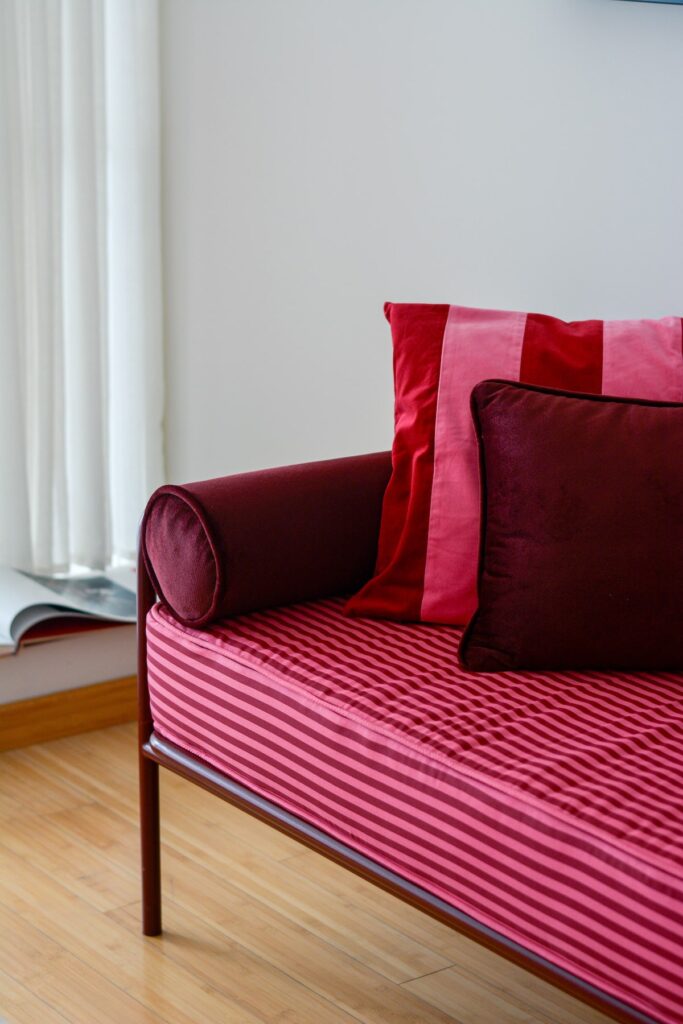 Las escaleras, pintadas de borgoña, llevan al segundo nivel, donde está el ropero con un sticker plateado, el baño y la habitación donde resalta la banca inspirada en la mítica Locus Solus de Gae Aulenti de los años sesenta, tapizada con una textura de rayas en fucsia, un color que a Angela la remite a la sierra del Perú. También hay un telar de cintura y una alfombra con la frase “Mi vida florece por ti”, ambos hechos en Cajamarca. La cabecera y tarima de la cama, en madera cachimba, tiene formas ovaladas y orgánicas que, para la directora de arte, invitan al descanso, y también fueron creadas por Greensalt Studio.