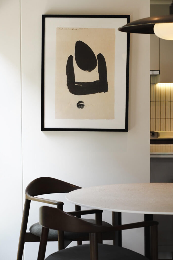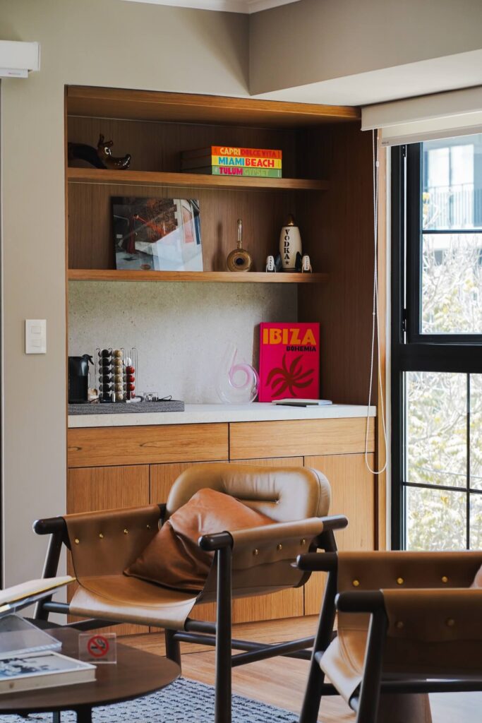 El gran sillón, profundo y envolvente, es probablemente el mueble más usado de todo el departamento. Es donde Rodrigo se toma el café de la mañana, mientras la luz entra con fuerza por las ventanas y va llenando de energía la casa. Al volver del trabajo, suele terminar en el mismo lugar: escuchando música y simplemente dejándose caer en el sillón.