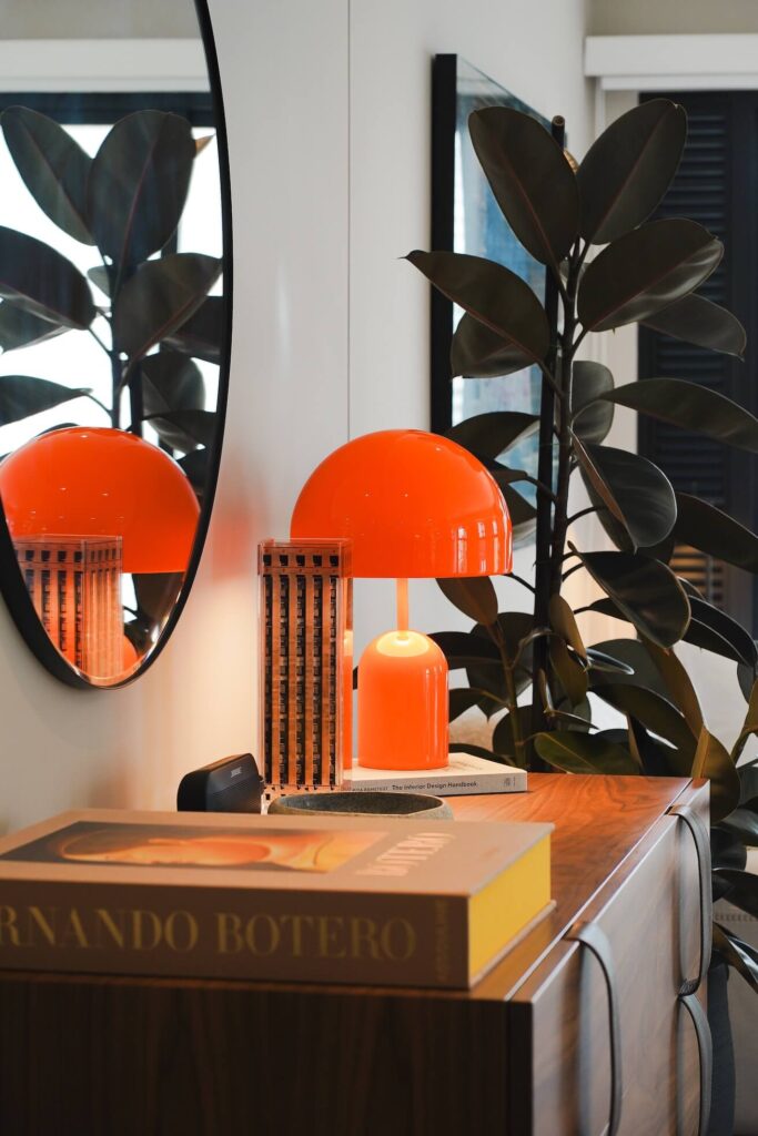 Otras decisiones fueron completamente suyas. Hace poco sumó dos lámparas nuevas: una pequeña, con una luz naranja que le da un punto vibrante a la sala, y otra que dialoga con la gran planta que lo acompaña desde que se mudó. Rodrigo no suele encender todas las luces de la casa por la noche; prefiere una iluminación suave, que va transformando el ambiente a medida que cae la tarde.